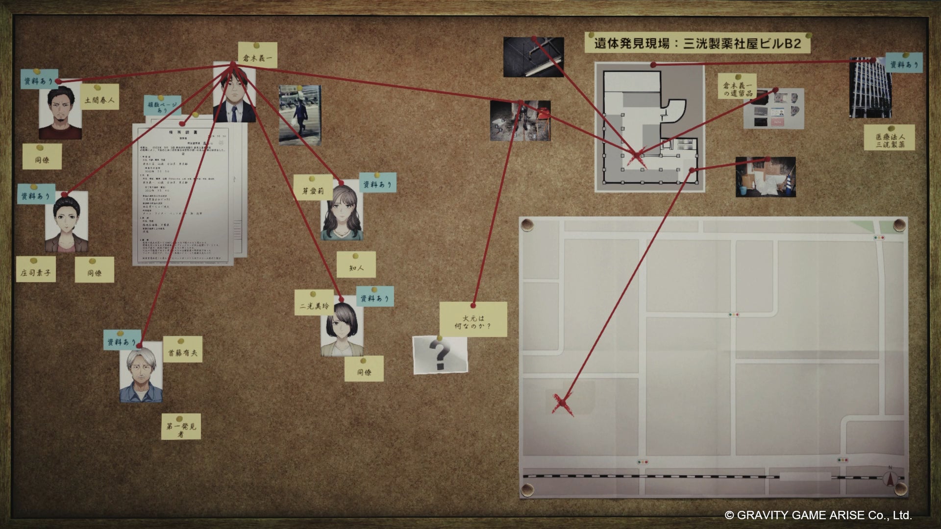 推理ドラマのようなエビデンスボードで情報を整理し、真相を突き止めます。