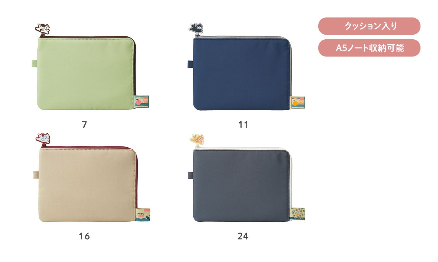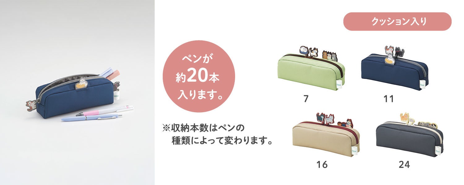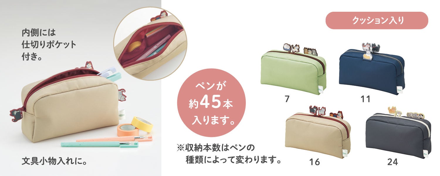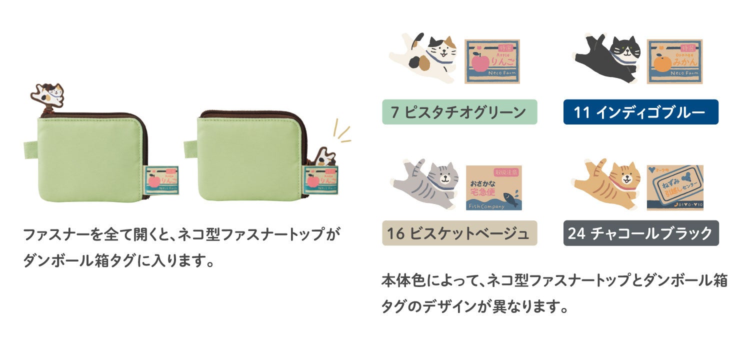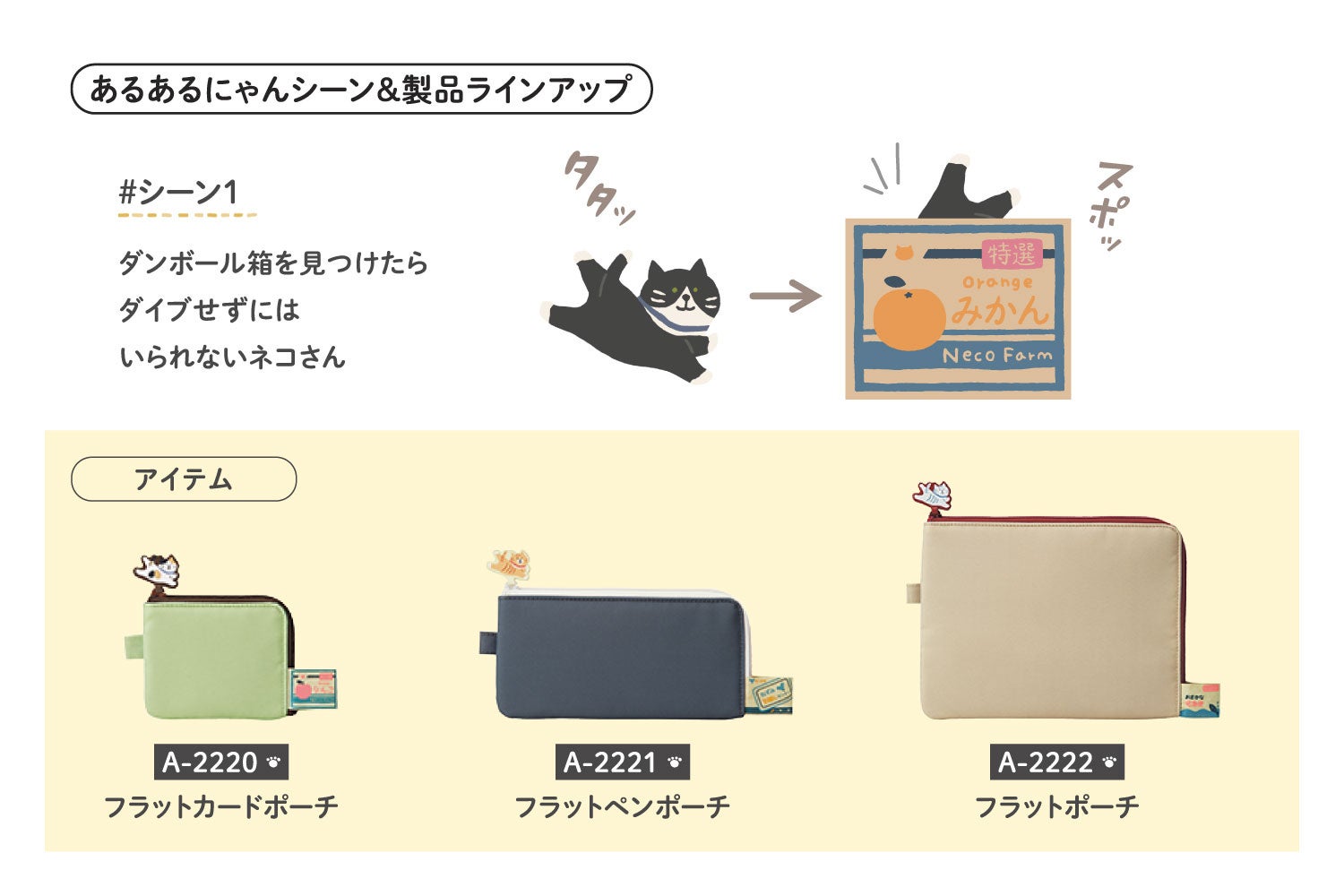 ダンボール箱に飛び込むネコや動くおもちゃに反応するネコなど、5つのあるあるシーンをネコ型のファスナートップで表現したペンポーチ・ポーチシリーズで、フラットカードポーチ、フラットペンポーチ、フラットポーチ、ボックスペンポーチ、ショルダーポーチ、キャリングスリーブがある。