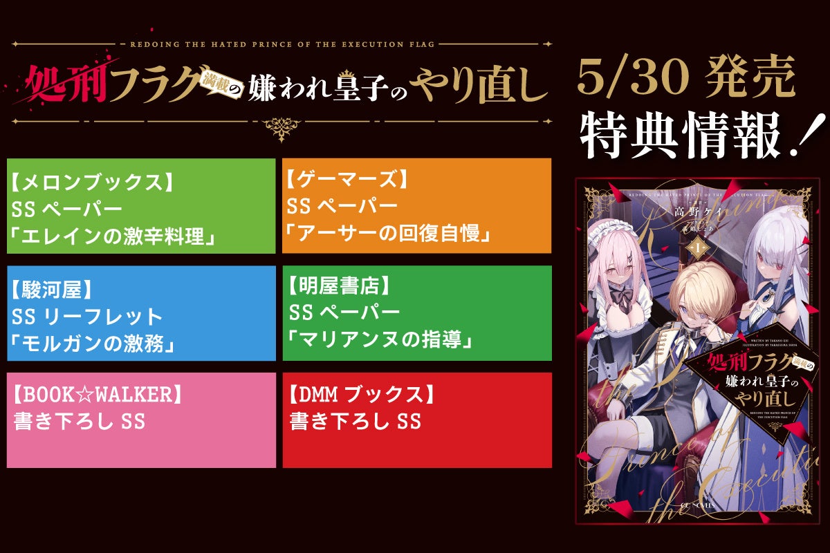 マイクロマガジン社が5月30日に発売したGCノベルズ『処刑フラグ満載の嫌われ皇子のやり直し 1』は、ブリテンの第二皇子が処刑された後、過去に戻り、善行ポイントを積みながら人々に優しく接する物語です。