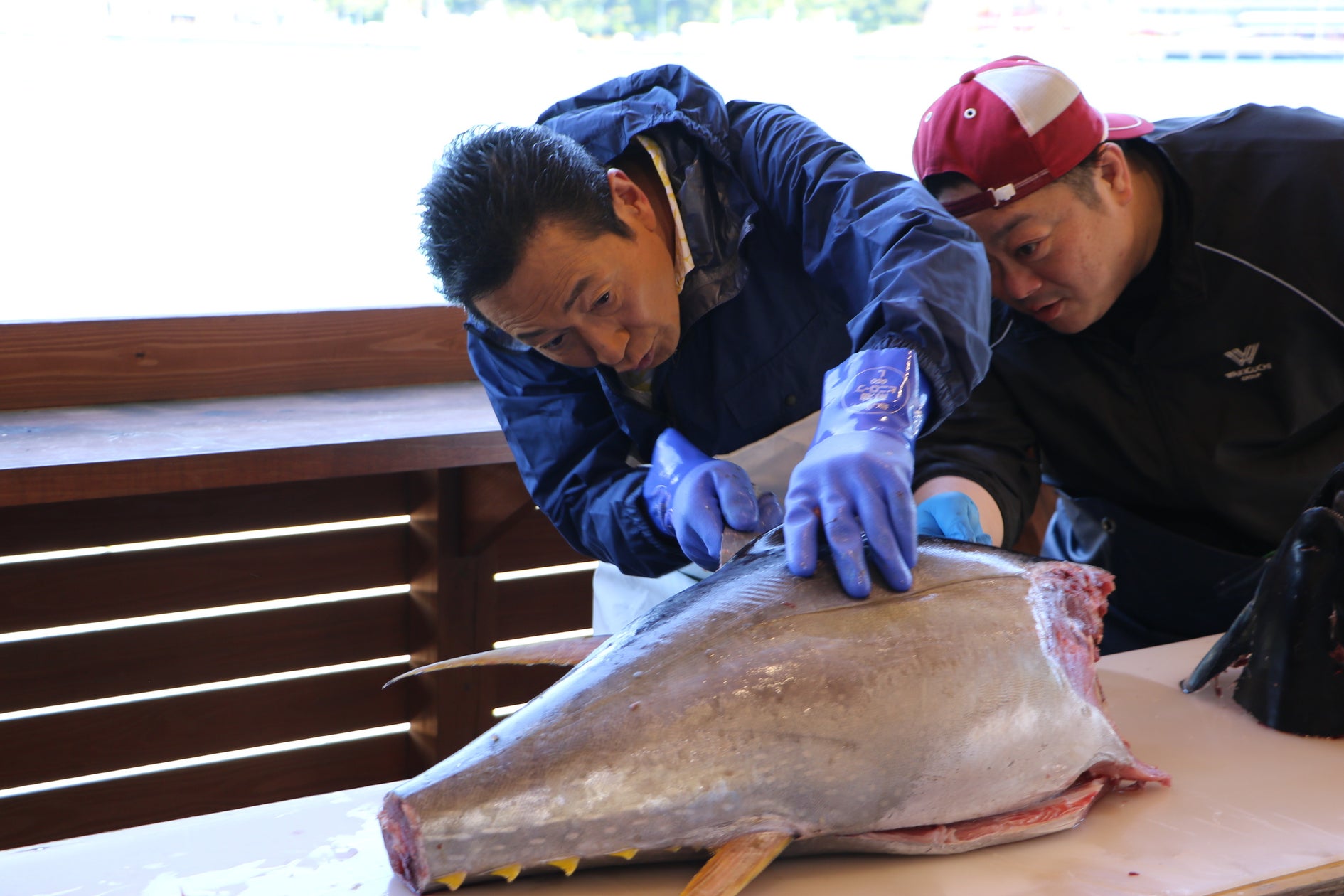 - 勝浦ではびんちょうまぐろの解体ショーを見学、三田村が初挑戦