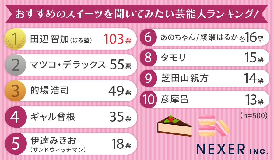 1位は「ぼる塾」の田辺智加さんで、スイーツに造詣が深く、信頼できるという理由が挙げられました。