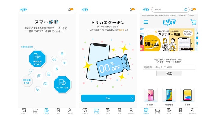 トリスマアプリは無料の故障診断アプリで、バッテリー劣化状態のチェックや中古iPhoneの購入が可能です。
