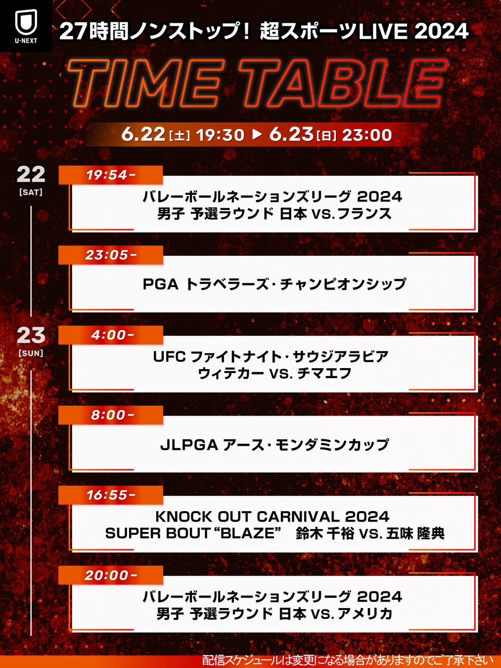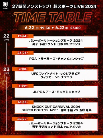 6月22日から23日にかけて、バレーボール「ネーションズリーグ・男子」や「UFC」、鈴木千裕vs五味隆典戦など国内外のトップスポーツが配信されます。