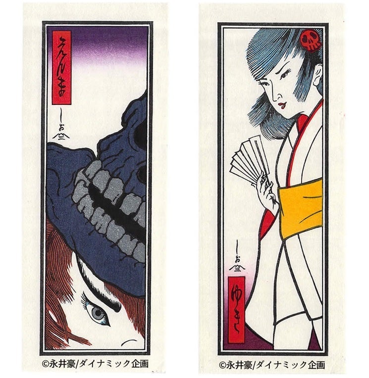 永井豪原作の『ドロロンえん魔くん』は、えん魔くんと仲間たちが悪い妖怪を退治するアクションアニメで、主人公のえん魔くんと雪子姫を現代の浮世絵師が描いています。