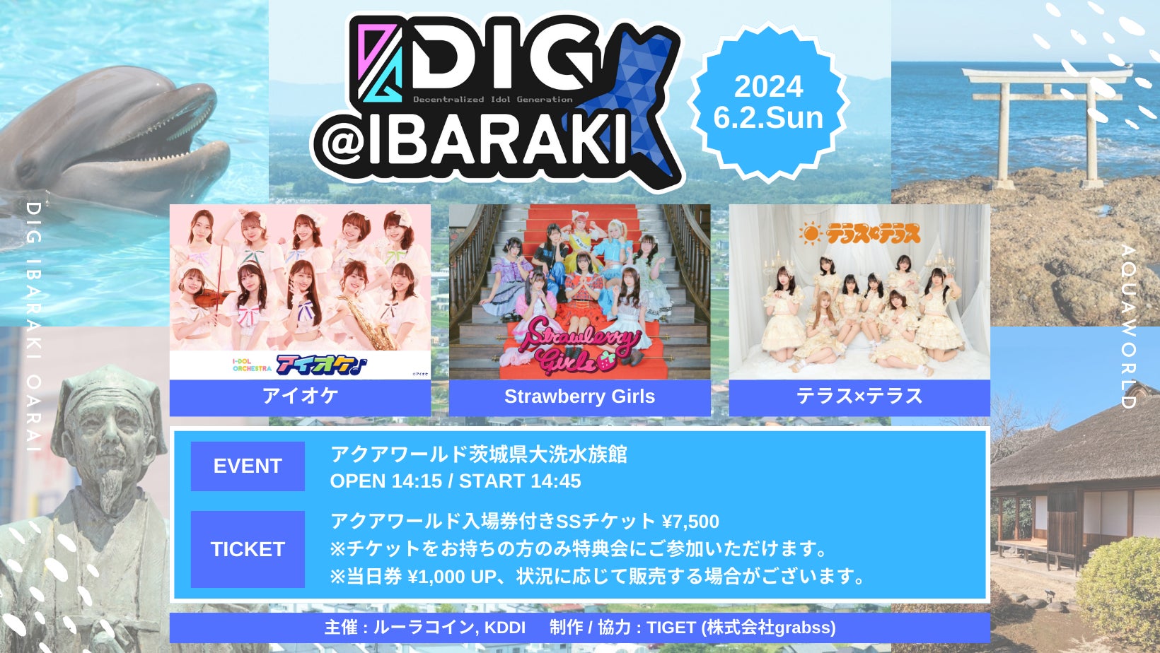 KDDIとルーラが協力して開催される「DIG @ IBARAKI」イベントでは、アイオケ、Strawberry Girls、テラス×テラスがアクアワールド茨城県大洗水族館でパフォーマンスを行います。