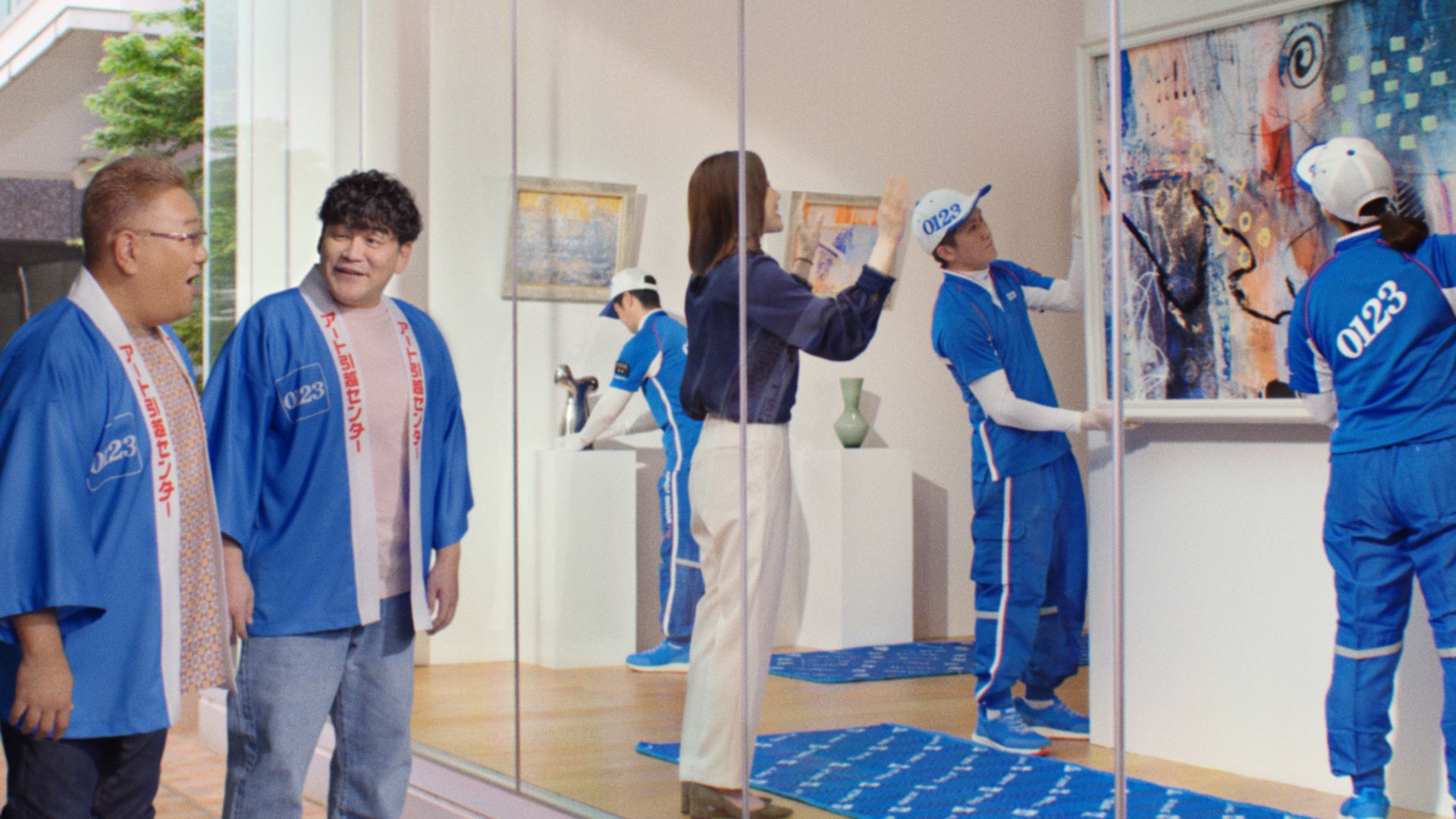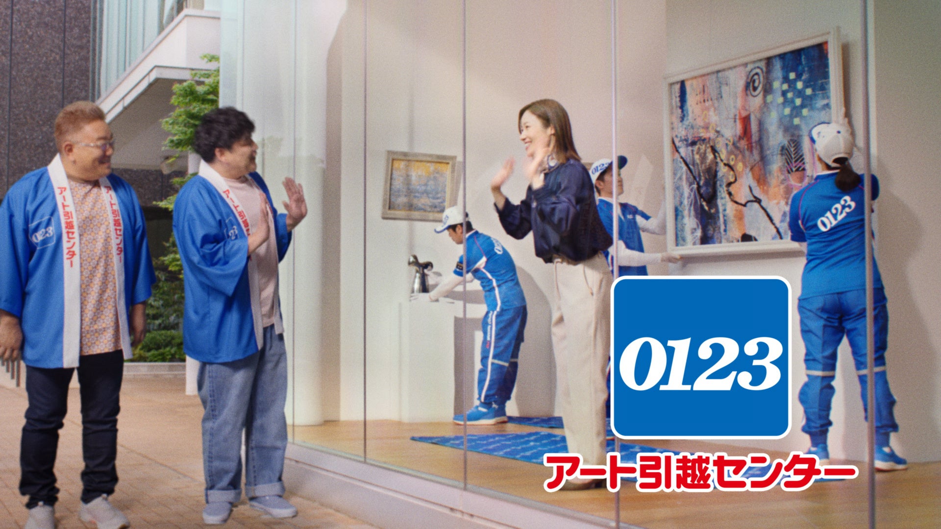 サンドウィッチマンの軽妙なやり取りで引越しサービスを紹介し、0123の活躍を表現しています。