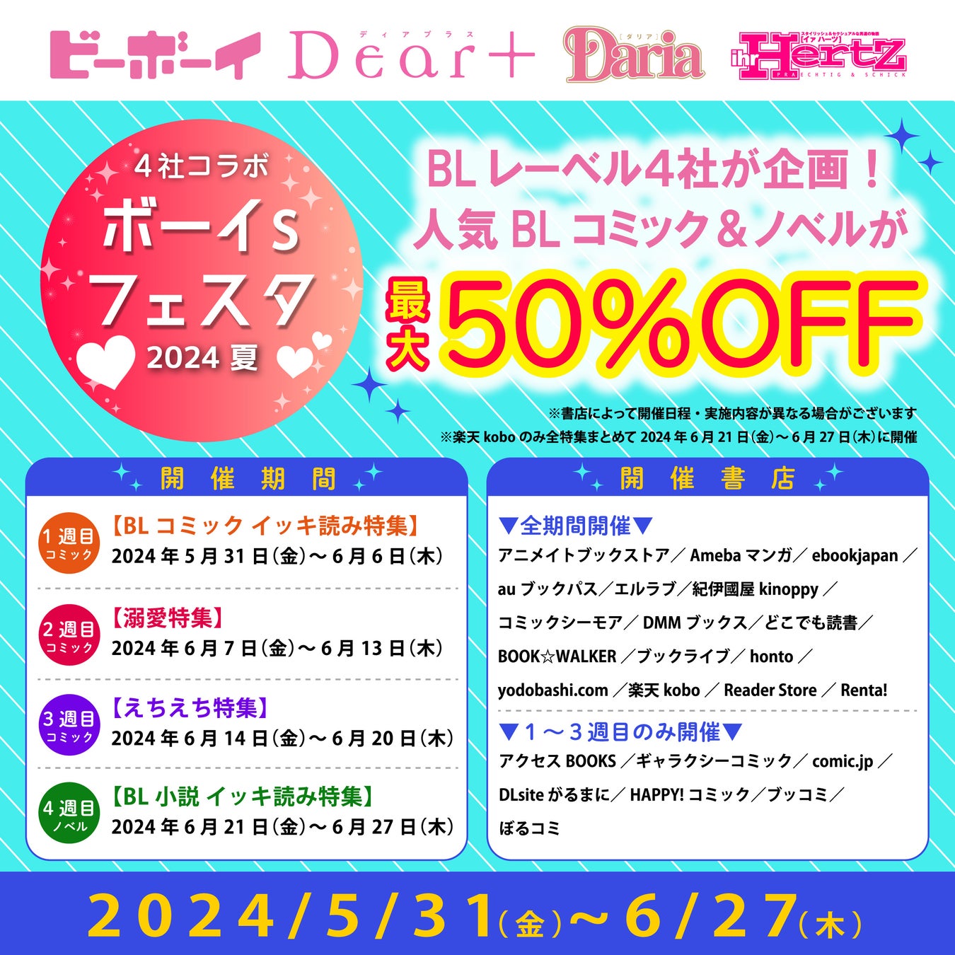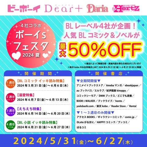 ボーイズラブ作品を愛する4つの出版社が合同で開催する「4社コラボ ボーイs フェスタ 2024 夏」が決定!最大50%オフで人気シリーズが楽しめるキャンペーンです。