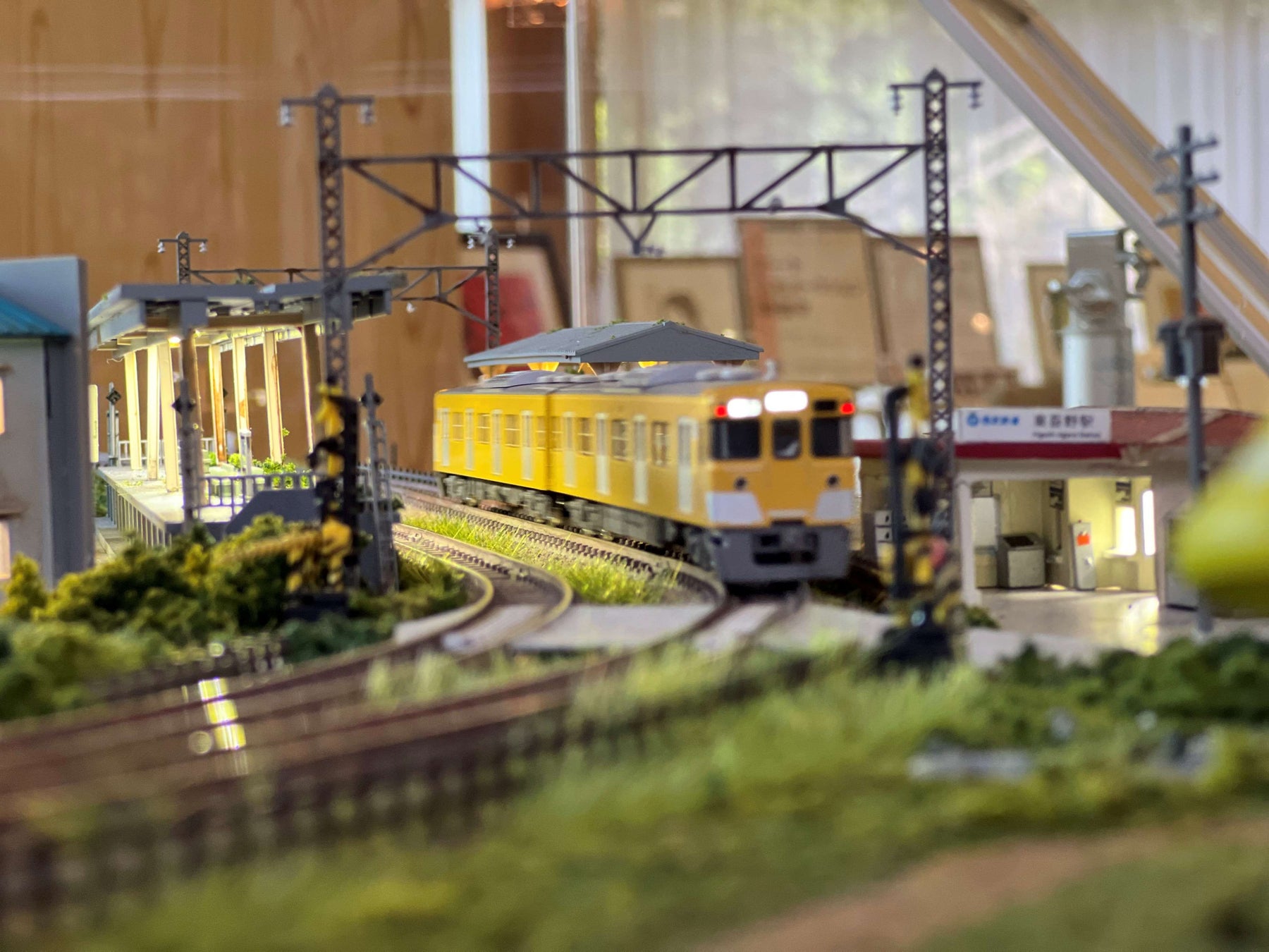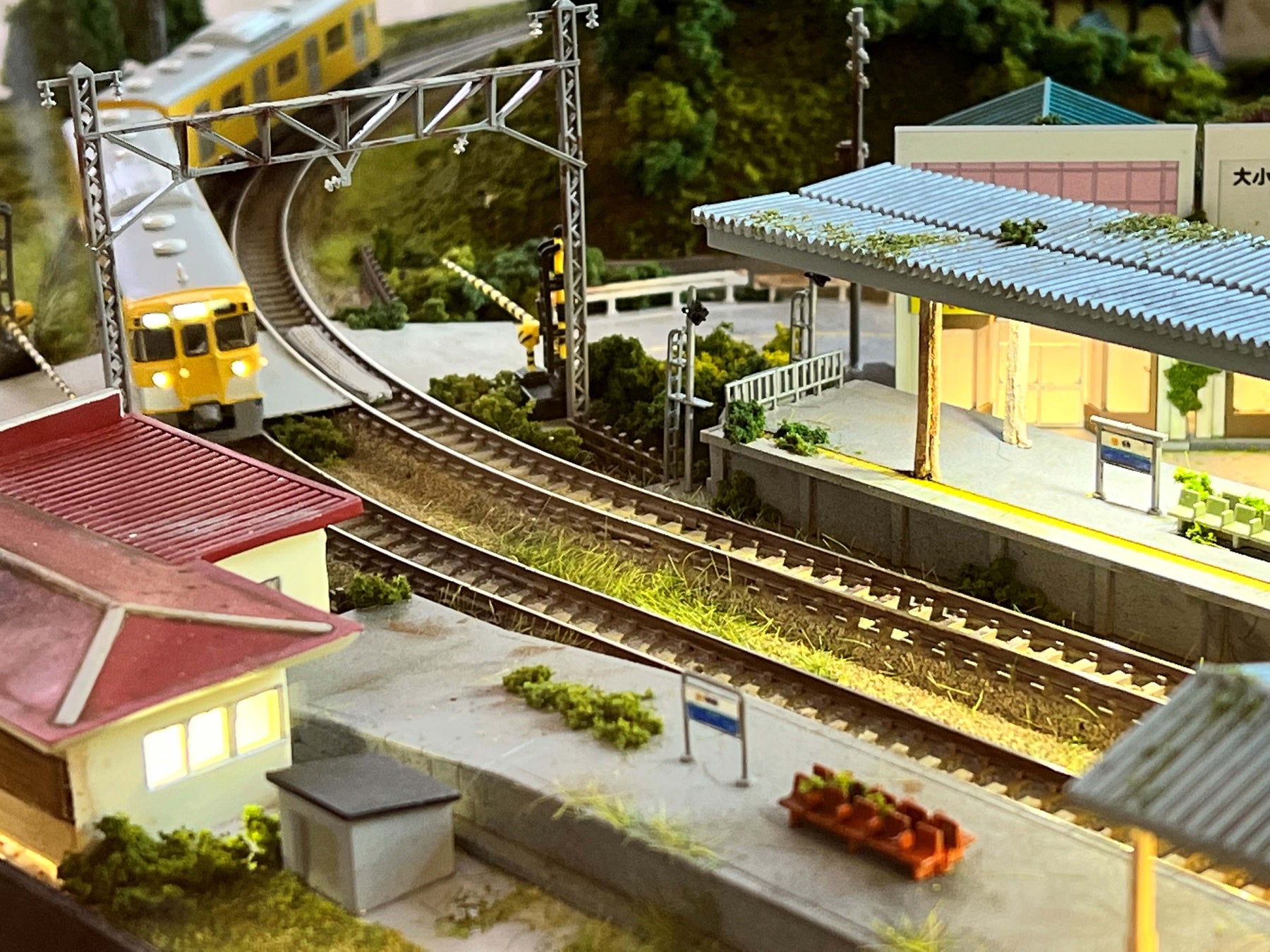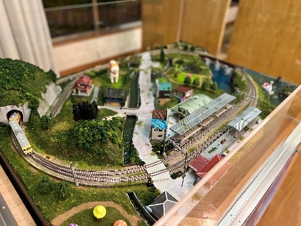 等身大のスタンディやフォトスポット、オリジナル鉄道ジオラマなどがあり、作品の世界観を再現している。