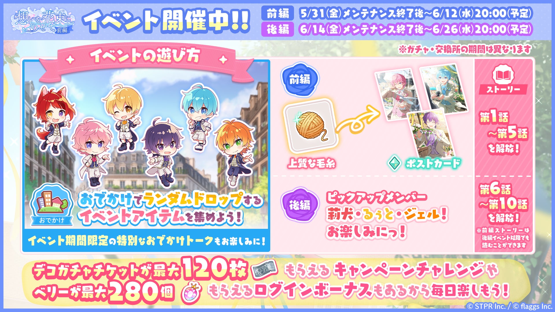 株式会社STPRと株式会社flaggsは、エンタメユニット「すとぷり」の公式ゲームアプリ「すとぷりWith!!」にて、6月の月間イベント「想いを花束にのせて」の前編を開催することをお知らせします。