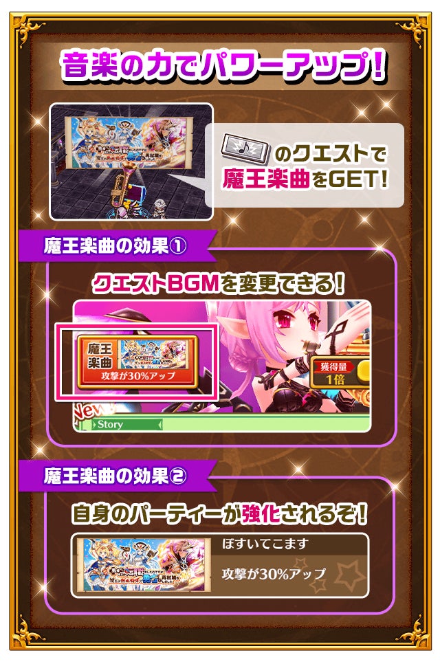 クエストで「魔王楽曲」を集めて強化し、楽曲のレビューも楽しめます。