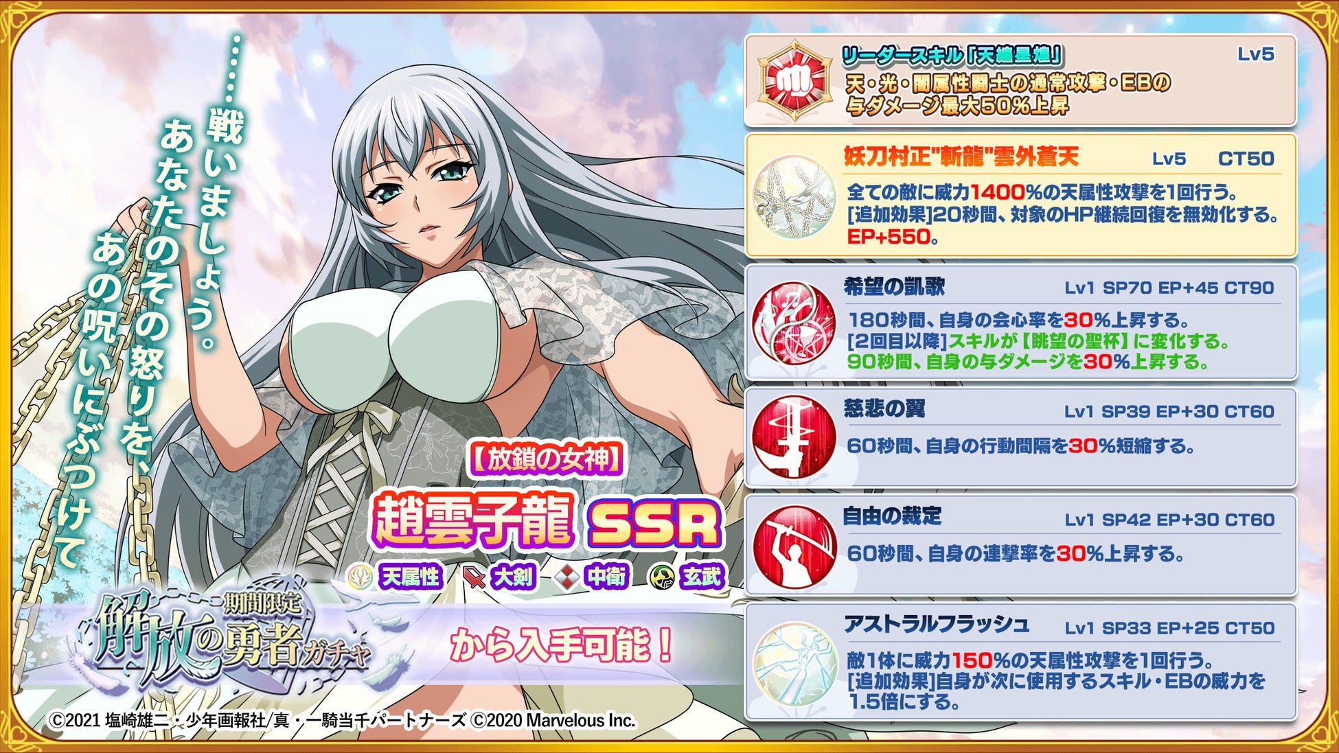 2024年5月31日から開催される「解放の勇者ガチャVol.1」では、CV浅川悠さん演じる「【放鎖の女神】趙雲子龍」が登場します。