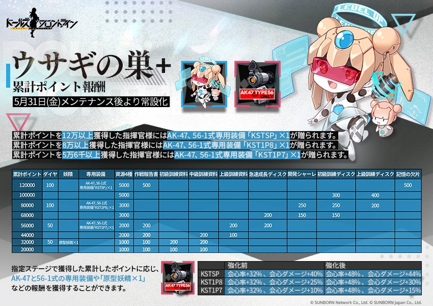 さらに、ランキング戦『ウサギの巣+』が常設化され、AK-47や56-1式の専用装備が獲得できるポイント報酬も用意されています。