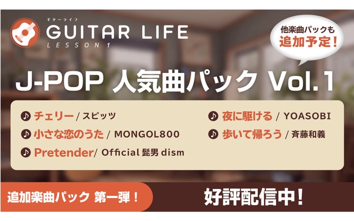 Nintendo Switch向けのギターレッスンソフト「GUITAR LIFE -LESSON1-」に、J-POP人気曲パックVol.1が本日より有料配信開始されました。