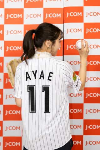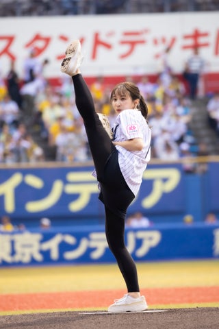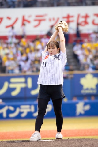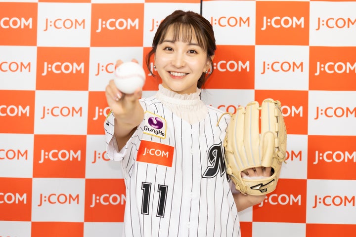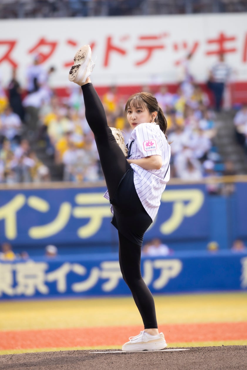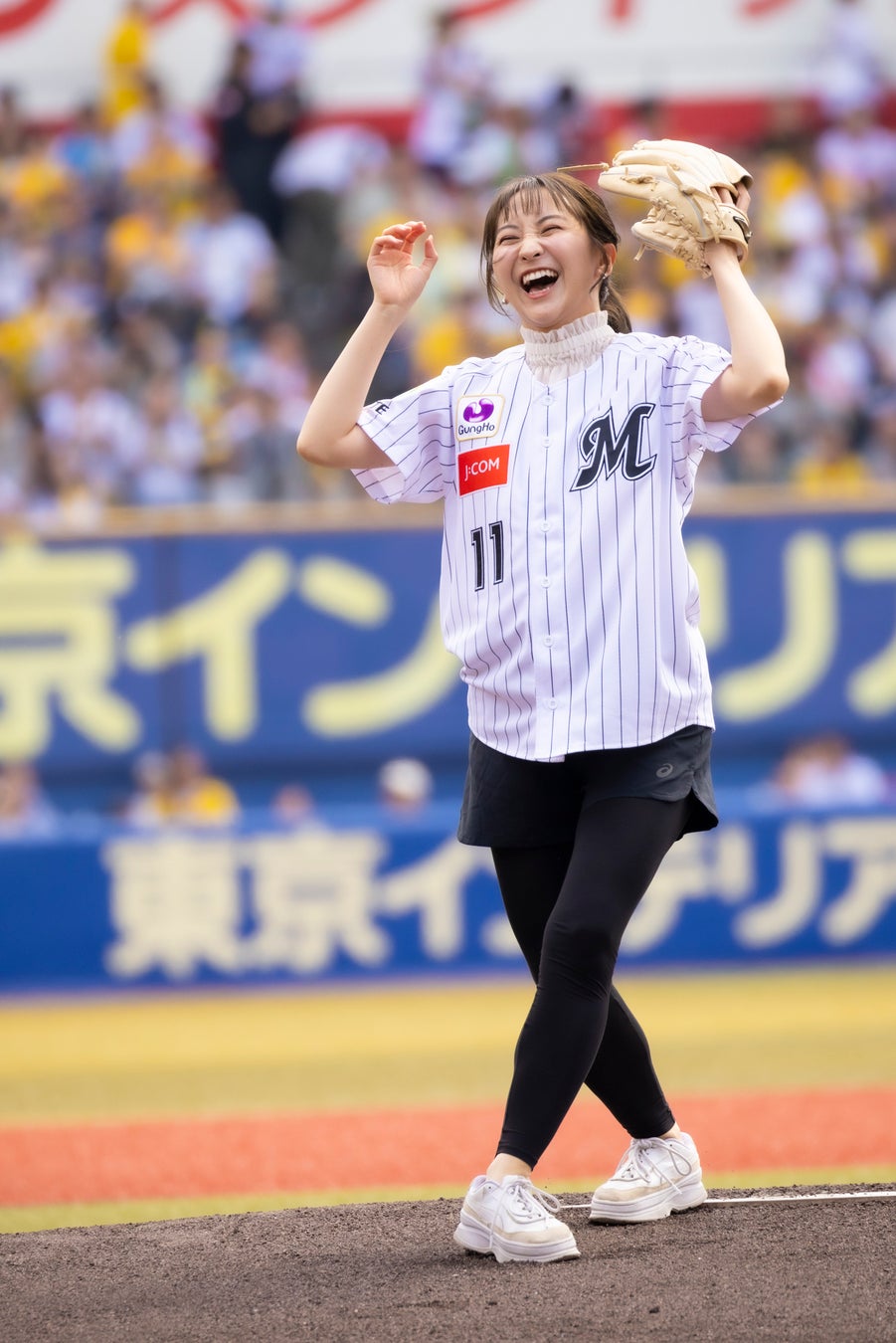 J:COMスペシャルデーでは、袴田彩会さんが11番のユニフォームで豪快な始球式を行いました。