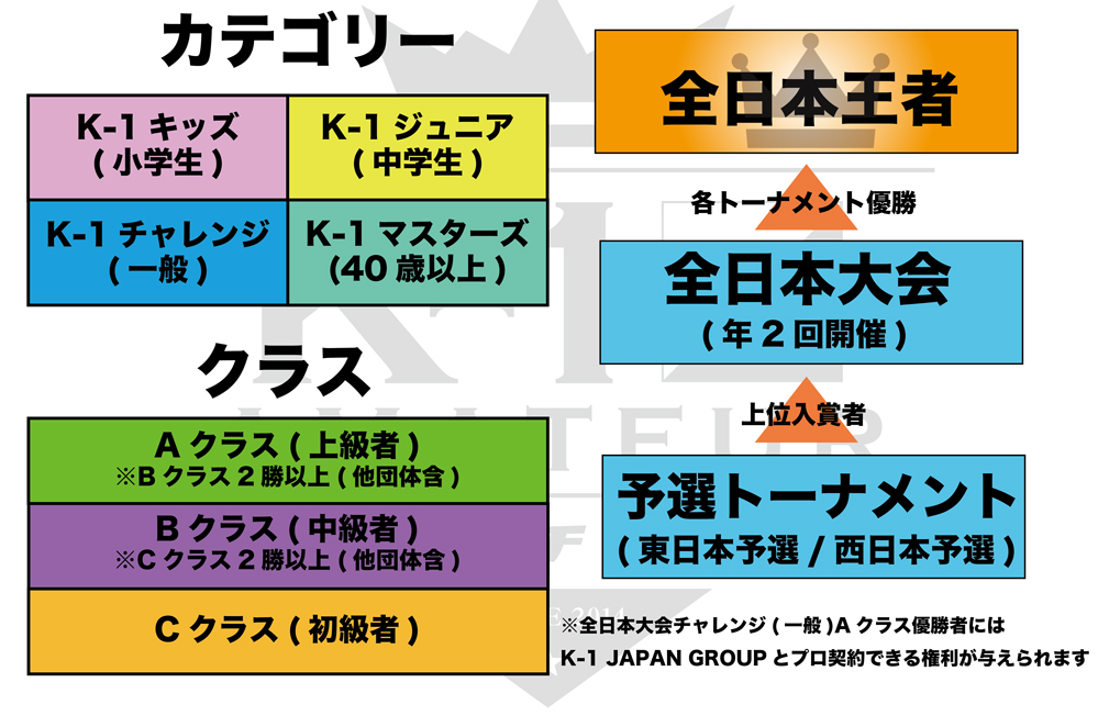 プロの頂点を目指す選手育成だけでなく、K-1の底辺拡大が目的で、キッズ(小学生)からマスターズ(40歳以上)までを年代別にわけ、そのカテゴリーごとに選手レベルに合わせてAクラスからCクラスまで設けられています。