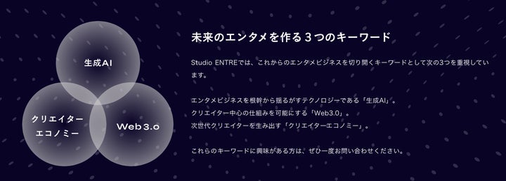 このプログラムは、起業初心者がスタジオのアセットを活用して独立経営や資金調達を目指すもので、現在は「生成AI」「Web3.0」「クリエイターエコノミー」に注力しています。