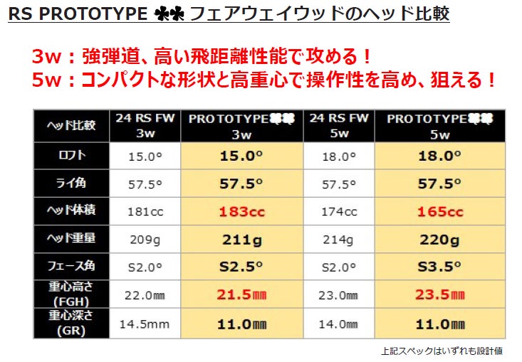 3w(15°)は強弾道と高い飛距離性能を備え、5w(18°)はコンパクトな形状と高重心で操作性を向上させています。