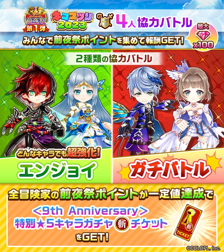 株式会社コロプラ(代表取締役社長:宮本貴志、本社:東京都港区、以下「コロプラ」)は、スマートフォン向け本格3DアクションRPG『白猫プロジェクト NEW WORLD’S(以下、『白猫』)』にて、まもなく9周年を迎えるにあたり、「9th Anniversary前夜祭第1弾」を開催したことをお知らせいたします。