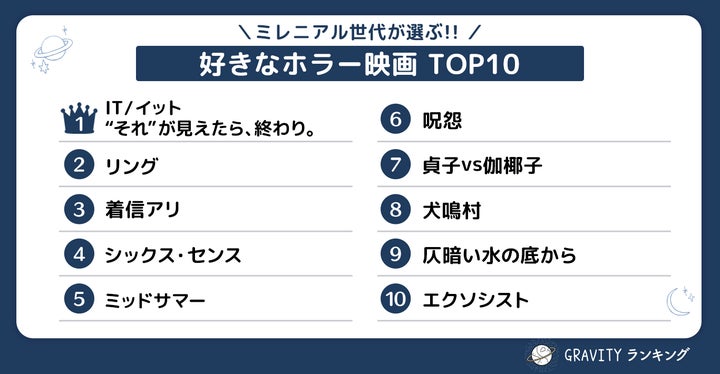 HiClub株式会社が提供するSNSアプリ「GRAVITY」が、20〜39歳の男女985名を対象に行ったユーザーアンケートから、「好きなホラー映画TOP10」ランキングを発表しました。