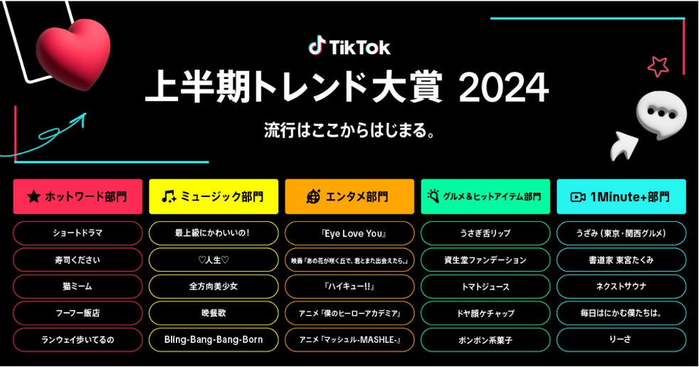 また、TikTok上半期トレンド大賞2024では、ハッシュタグや楽曲、エンタメなど5部門のトレンドがノミネートされ、6月20日に結果が発表されます。