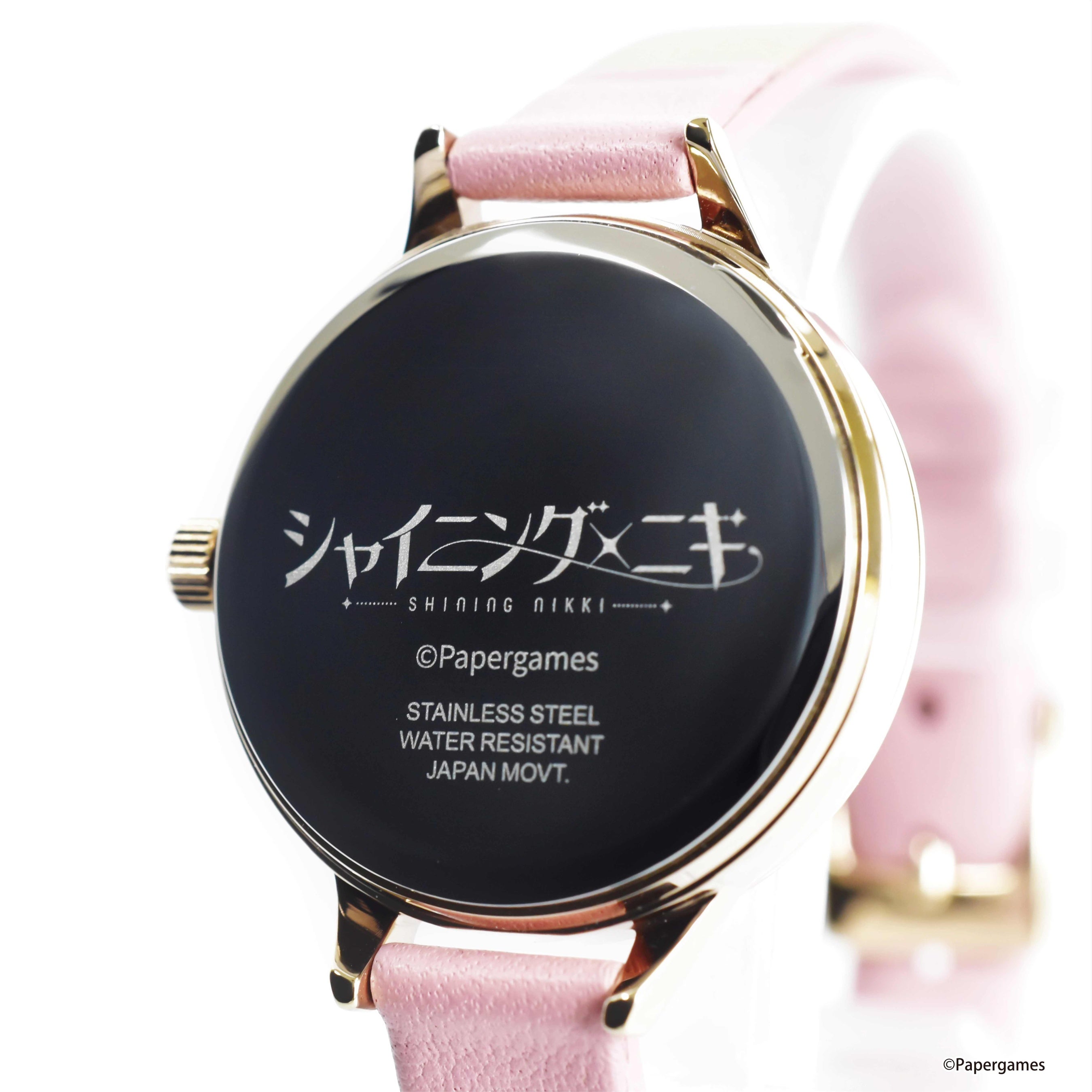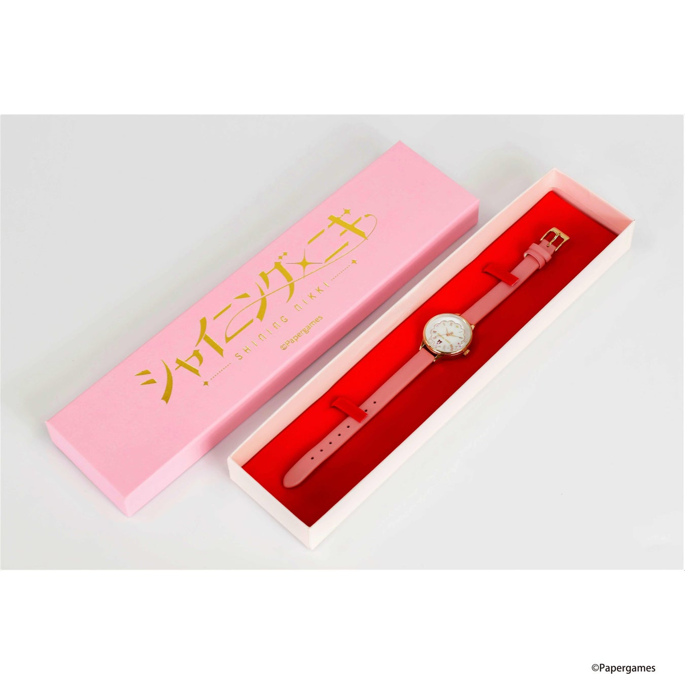 腕時計本体をしまうための専用化粧箱も、おしゃれなデザインで腕時計にピッタリ。淡いピンク色の箱に『シャイニングニキ』のタイトルロゴをゴールドで箔押ししました♪