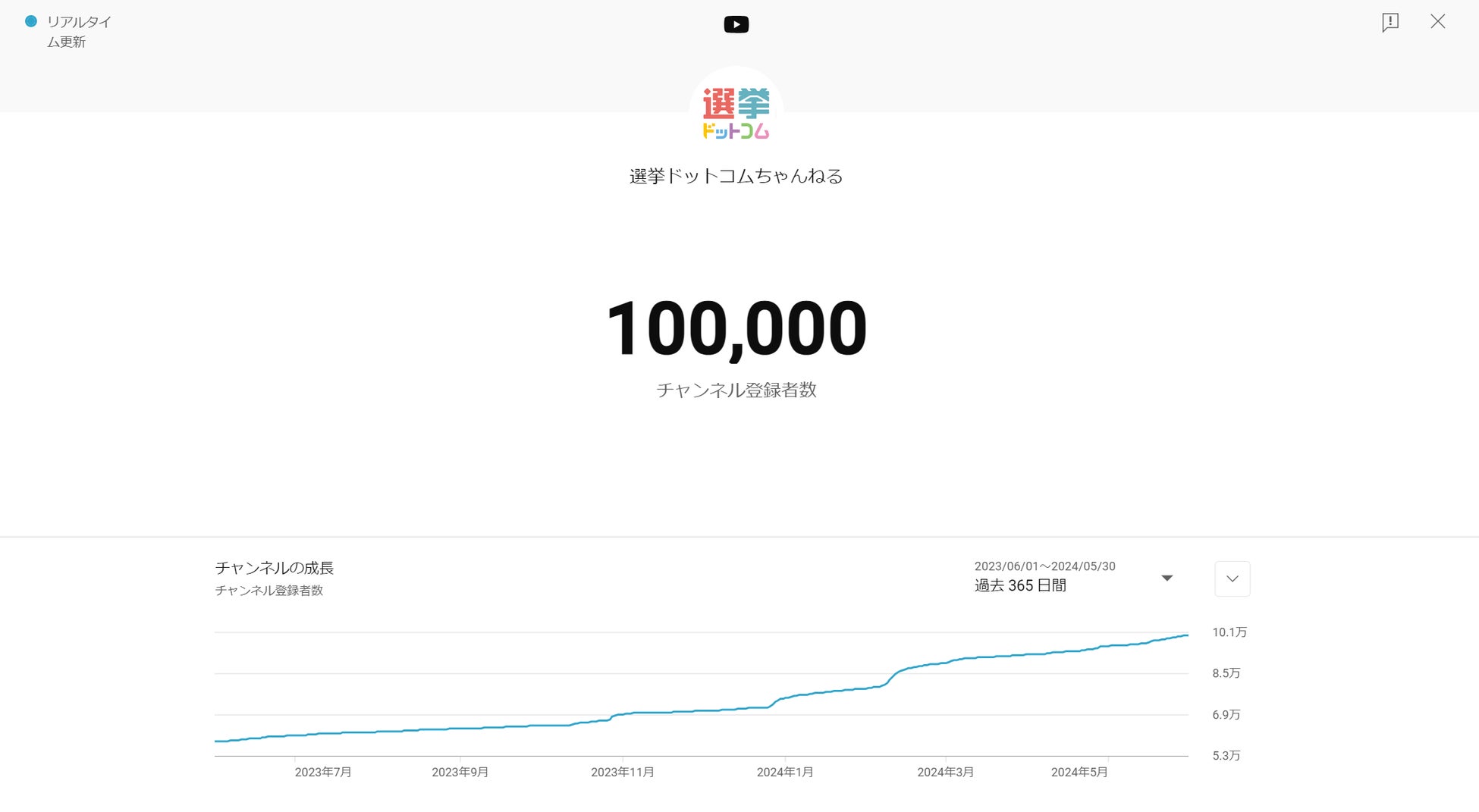 - 選挙ドットコムちゃんねるの登録者が10万人突破