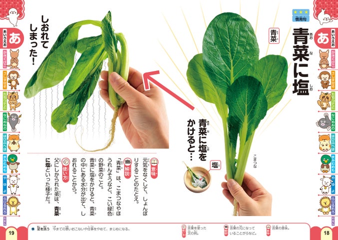 例えば、「青菜に塩」や「ぬれ手であわ」などのことわざの意味を写真で分かりやすく説明しています。