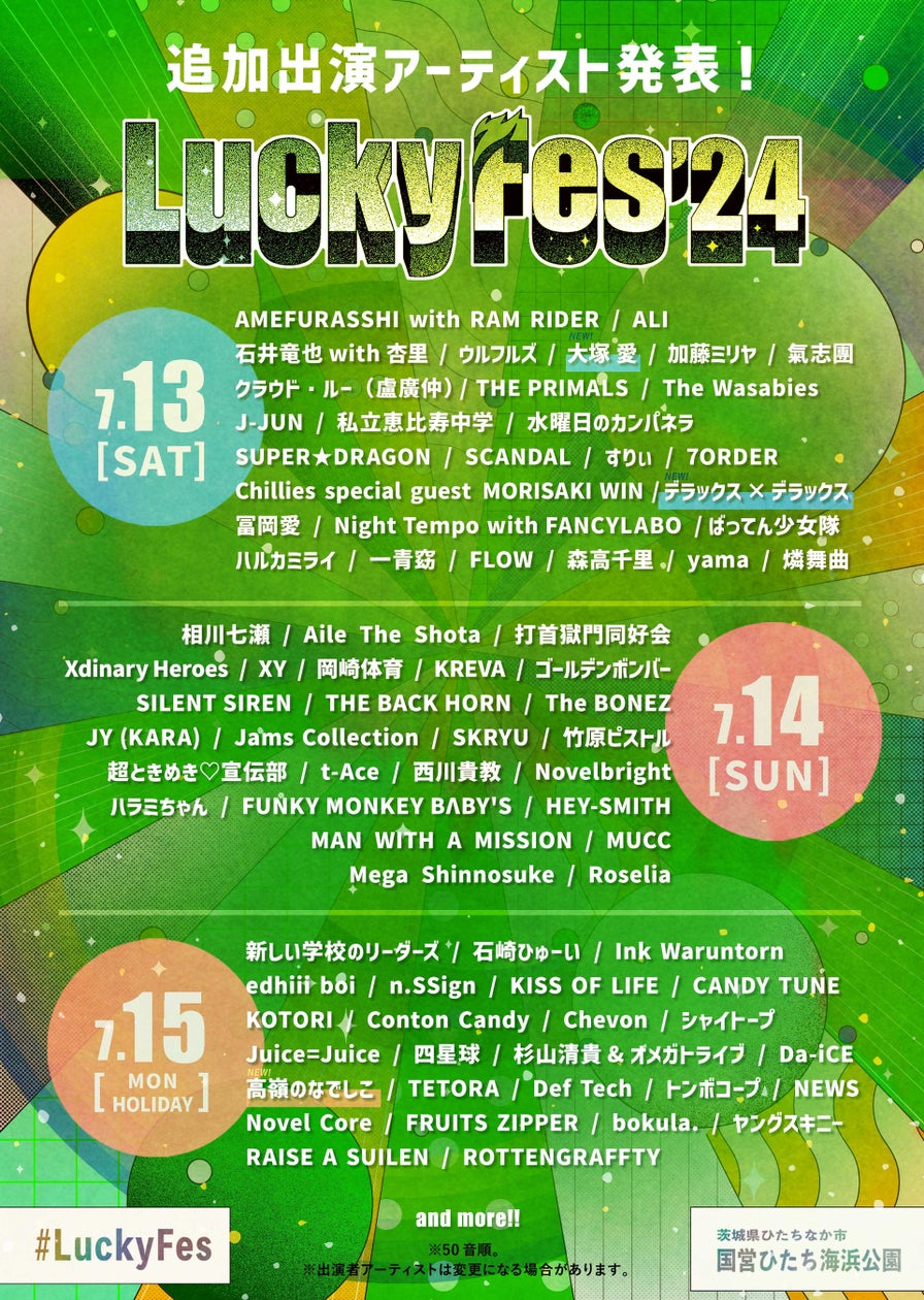 株式会社LuckyFM茨城放送は、7月13日から15日の3連休に国営ひたち海浜公園で開催される音楽フェス「LuckyFes’24」の追加アーティスト3組を発表しました。