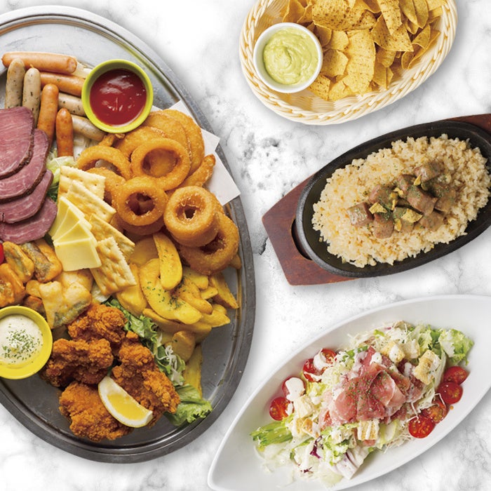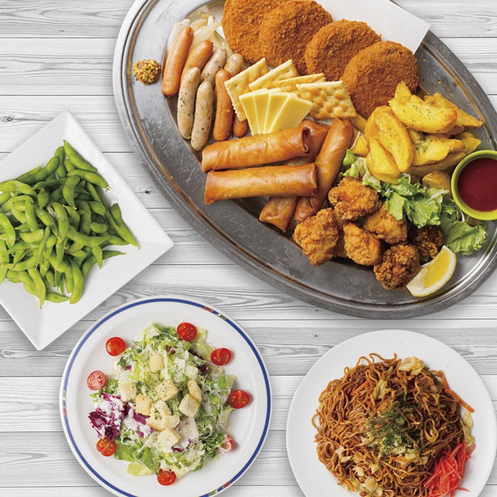 飲み放題付きのコースには、スカイパーティコースやスペシャルオードブルコースがあり、ソーセージ盛り合わせやポテトフライなどの定番メニューも充実しています。