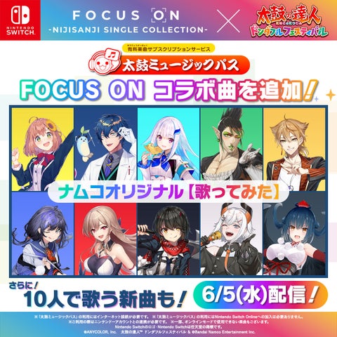 バンダイナムコエンターテインメントは、Nintendo Switch向け人気ゲーム「太鼓の達人 ドンダフルフェスティバル」に、にじさんじのVTuberが参加する音楽プロジェクト「FOCUS ON – NIJISANJI SINGLE COLLECTION –」関連楽曲を有料サブスクリプションサービス「太鼓ミュージックパス」で6月5日より配信開始しました。