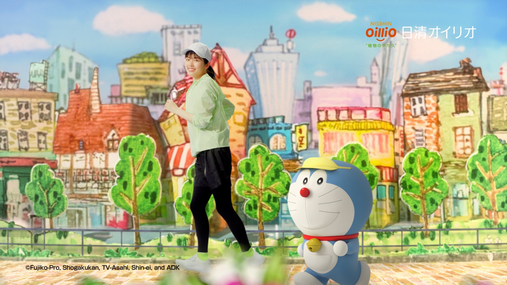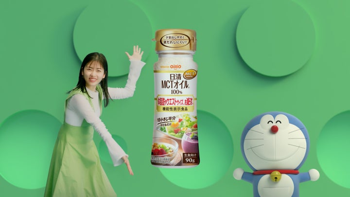 小芝風花さんとドラえもんが出演し、BMIが高めの方向けの体脂肪減少食品「日清MCTオイルHC」を楽しく紹介します。