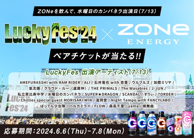 若者のテンションが最高潮に達している雰囲気を「ZONe ENERGY SUMMER VIBES」というネーミングで表現しており、さらにZONeを飲んで水曜日のカンパネラ出演のLuckyFesチケットが当たるキャンペーンも実施されます。
