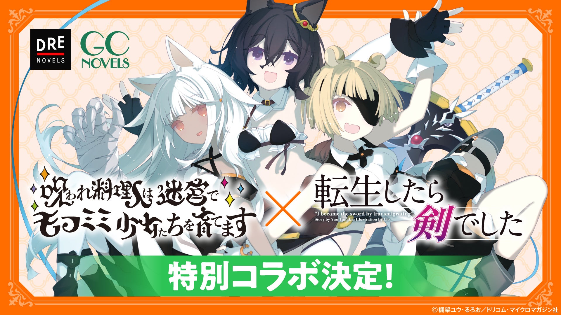 棚架ユウ先生とるろお先生のコラボ作品『呪われ料理人は迷宮でモフミミ少女たちを育てます』が発売決定!るろお先生の『転生したら剣でした』とのイラストコラボも注目です。