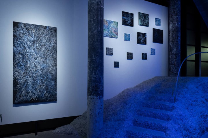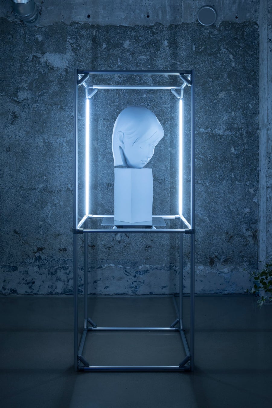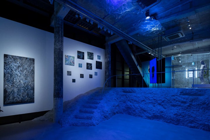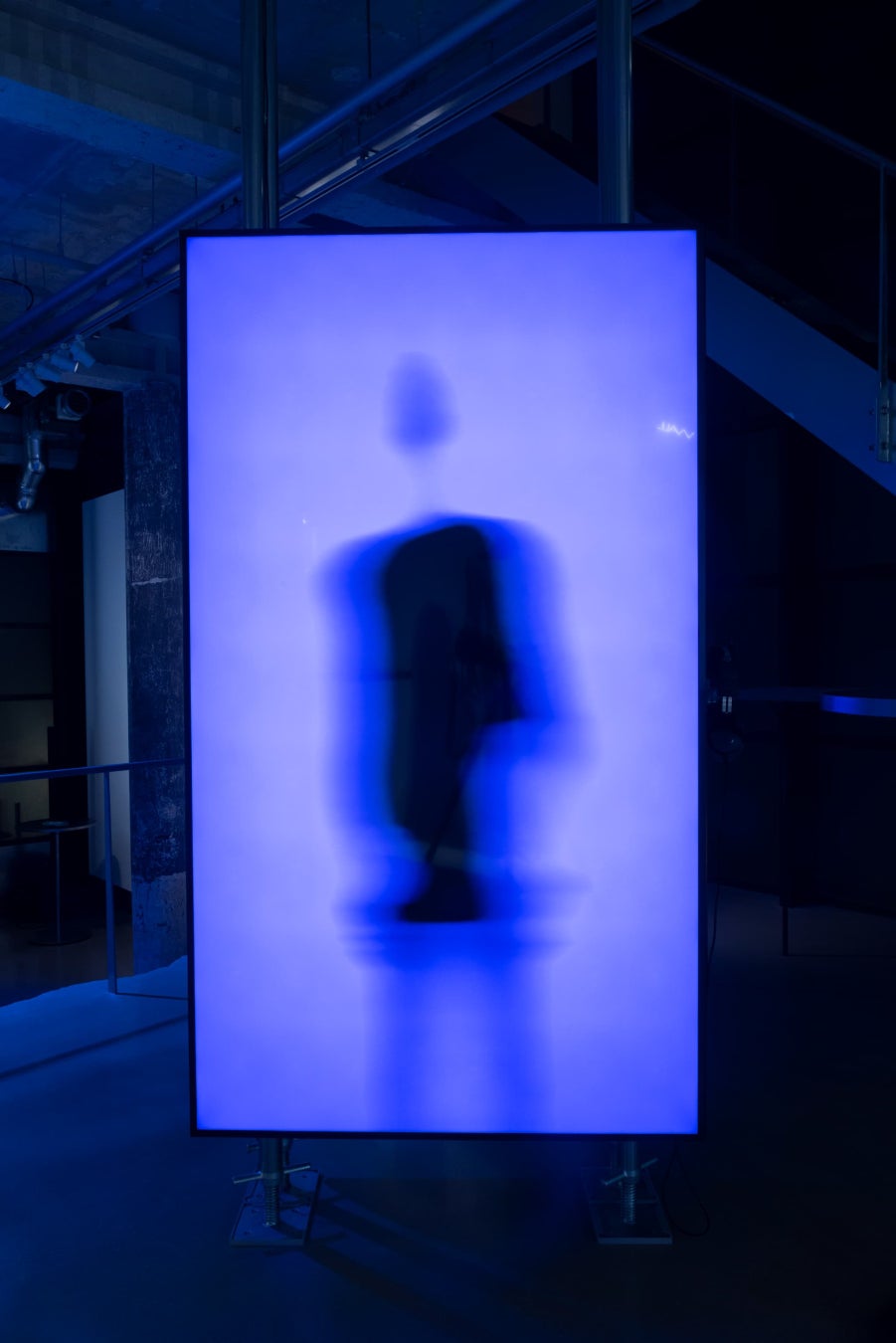 布施琳太郎は聴覚に焦点を当て、青い光と機械の声を組み合わせた作品を展示。