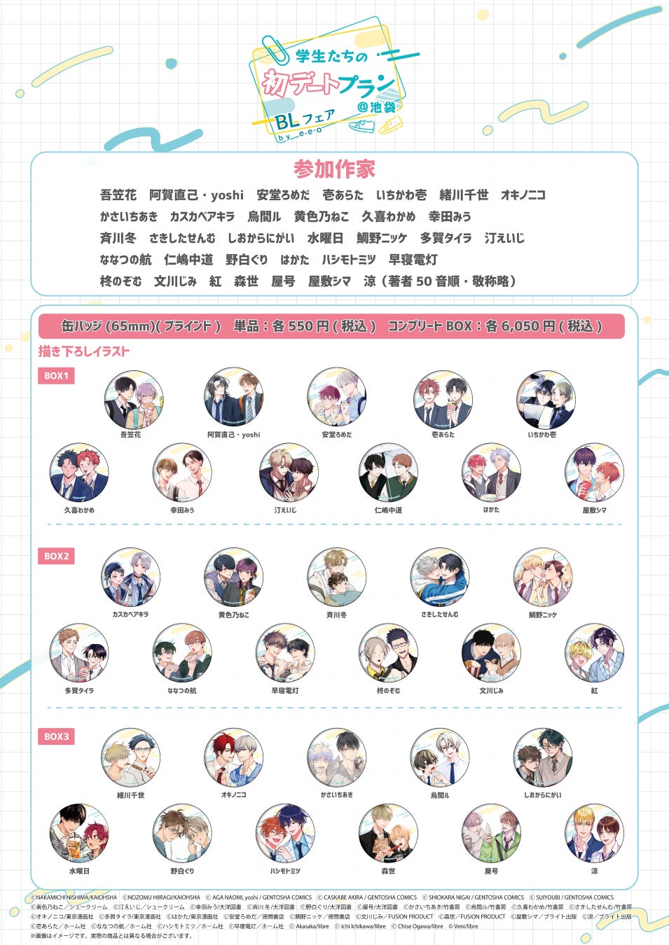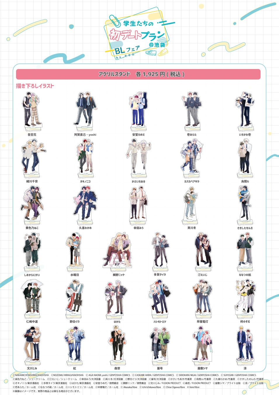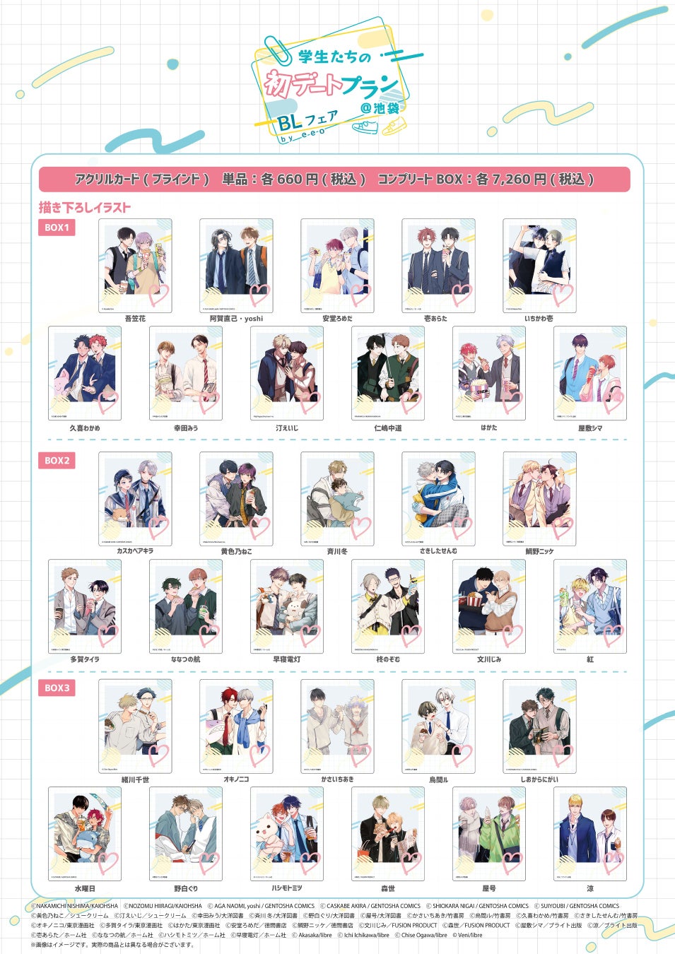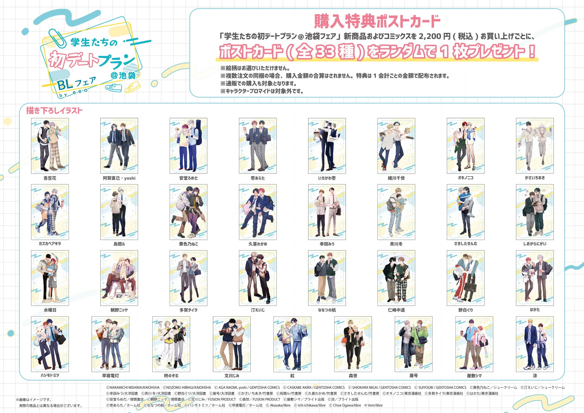 学生カップルの初デートをテーマにした描き下ろしイラストを使用したグッズが販売され、購入特典としてポストカードがランダムでプレゼントされます。