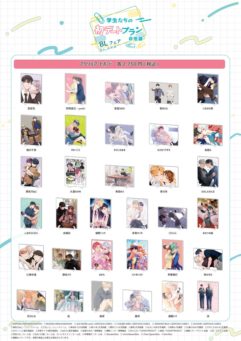 出版社11社と人気作家34名が参加し、描き下ろしイラストを使用した新作グッズの販売や購入特典のプレゼント、描き下ろし複製原画の展示、ガラポン抽選会、フォトスポットなどの参加型企画が行われます。