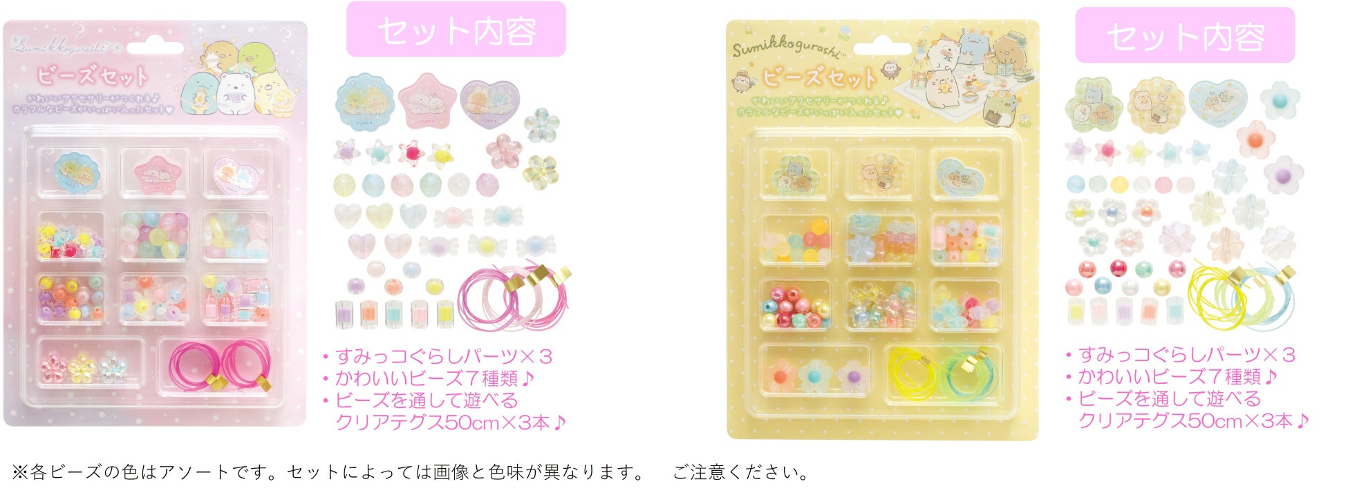 商品ラインナップにはミニメモ、ステッカー、ビーズセット、ぬいぐるみなどが含まれており、自分だけのすみっコアクセサリーを作ることもできます。