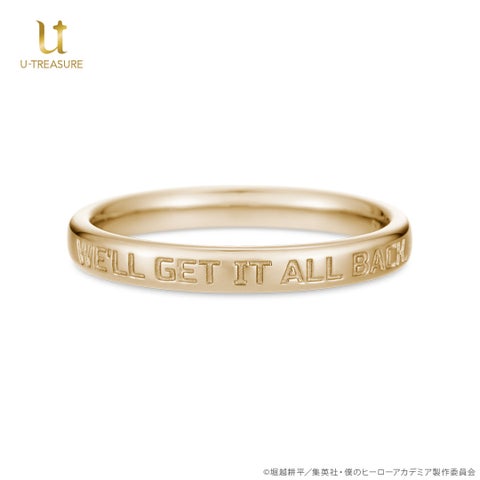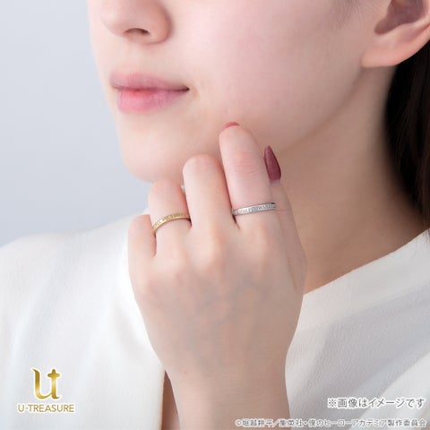 リングにはキャラクターのセリフが英語で刻印され、シルバーとK10イエローゴールドの2種類が用意されています。