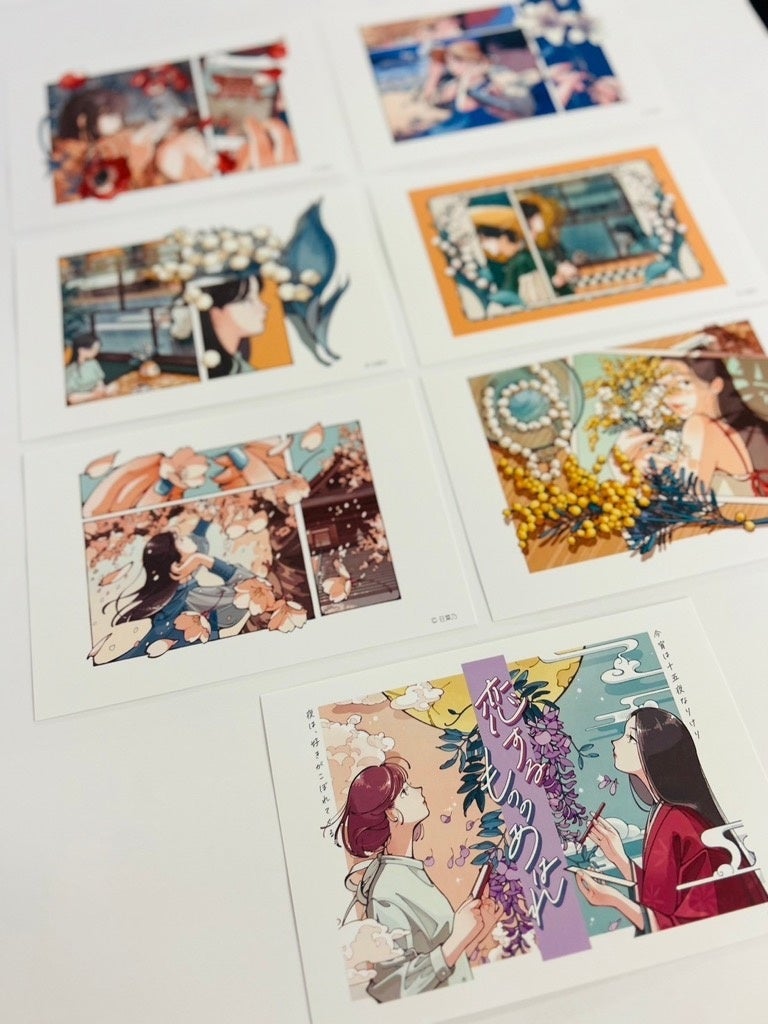 また、展示イラストのポストカードも販売中で、日菜乃さんの作品が展示されています。
