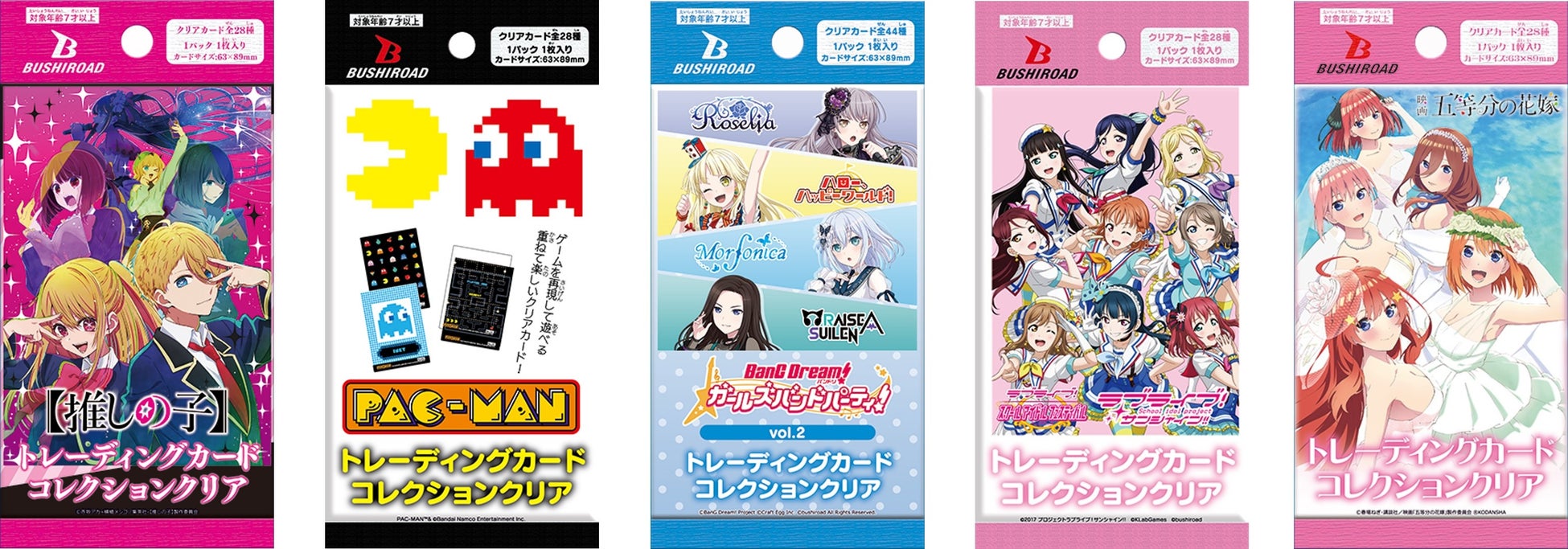 - 収録作品は「【推しの子】」「パックマン」「バンドリ! ガールズバンドパーティ!vol.2」「ラブライブ!サンシャイン!!」「映画「五等分の花嫁」」で、価格は1パック110円(税込)でレアリティがないため集めやすく、気軽に手に取れる