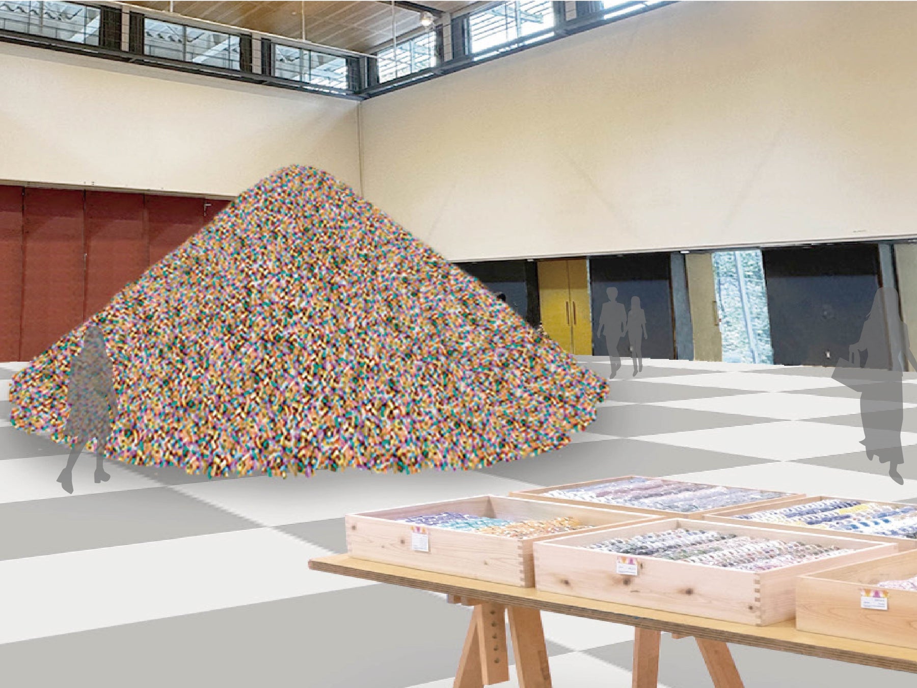 マスキングテープを使ったインスタレーションやサスティナブルな取り組みが特徴で、製造過程で生まれる端を使用した4mの”ヘタ山”などが展示されます。