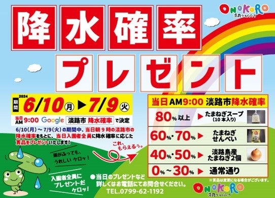2024年6月10日から7月9日まで、淡路ワールドパークONOKOROでは、朝9時の降水確率によって入園者全員にプレゼントがもらえるキャンペーンが開催されます。