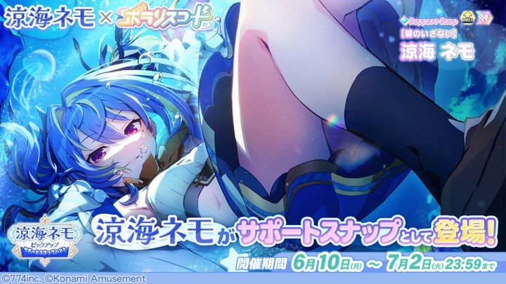期間中は『涼海ネモ』の楽曲がゲーム内で楽しめ、キャラクター「コンテンター」と「サポートスナップ」も登場します。