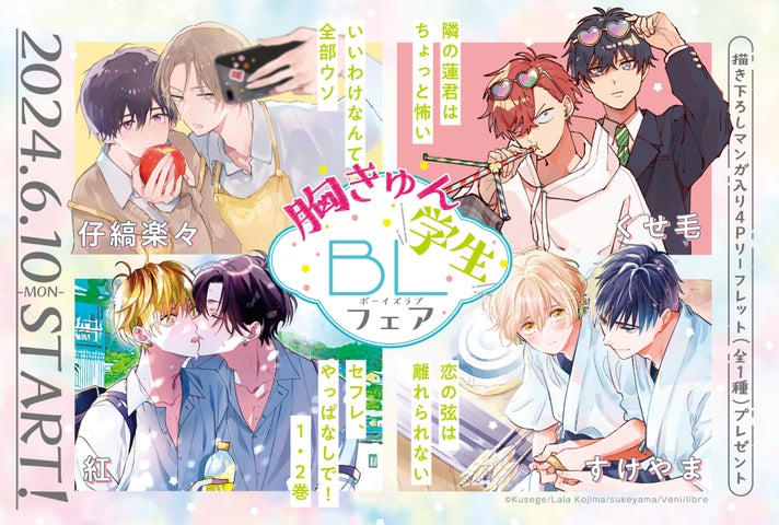 2024年6月10日から開催される「胸きゅん学生BLフェア」では、人気作家による描き下ろしマンガ入りの4Pリーフレットがプレゼントされます。