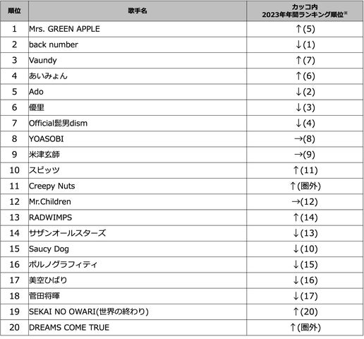 - Mrs. GREEN APPLE、Creepy Nuts、Vaundy、tuki.、天童よしみ