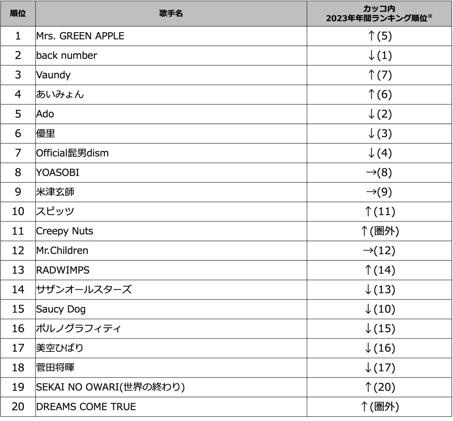 また、DAMのカラオケランキングではMrs. GREEN APPLEが1位に輝き、Creepy Nutsも初めて20位内にランクインしました。