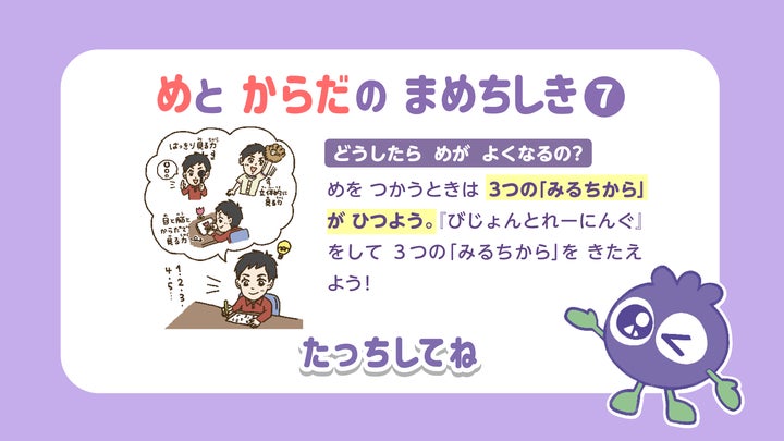 • ゲーム内容は目の健康を考える『ブルブルくんたっち!』で、反応力や識別力を育む