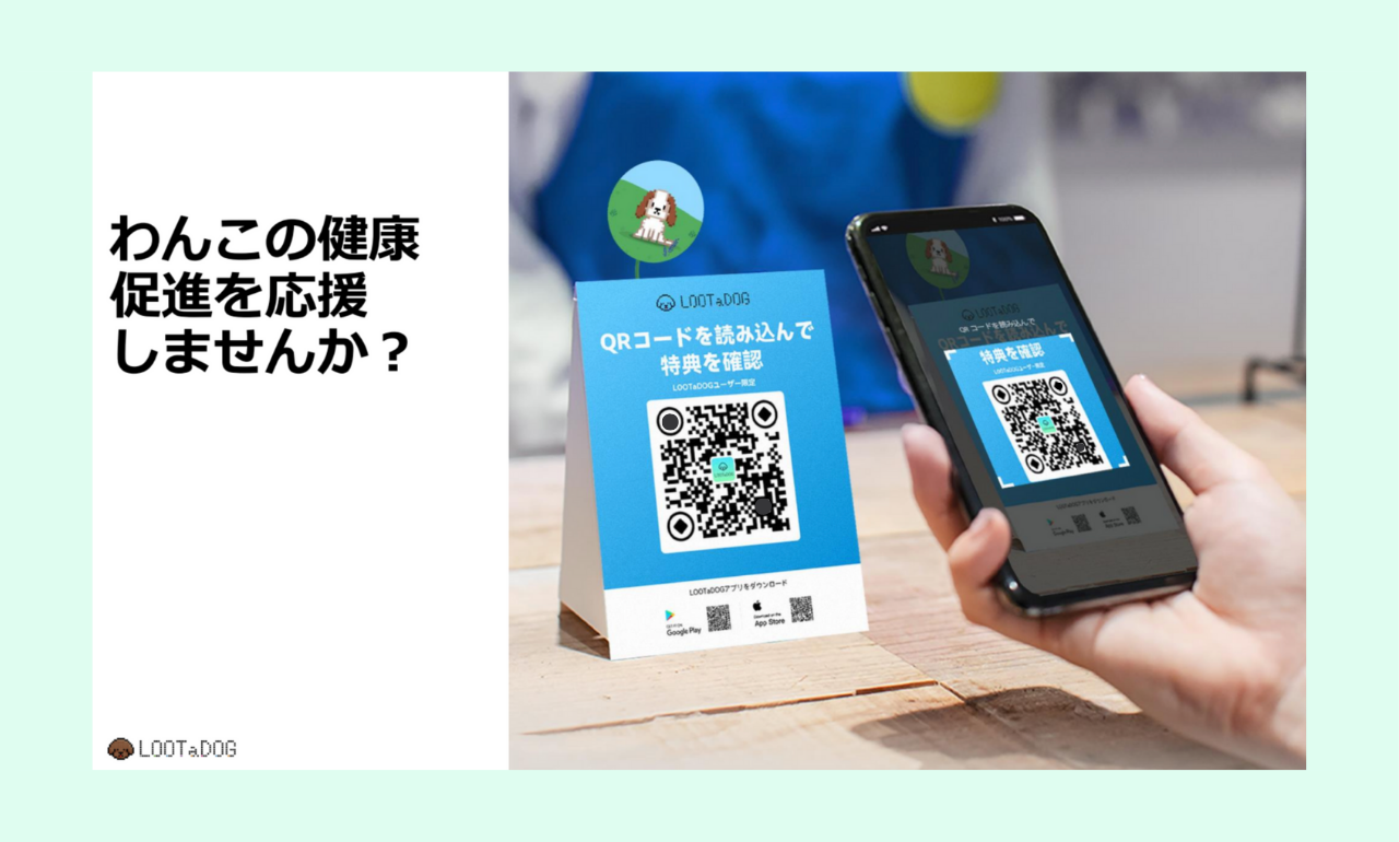 また、これらを実現するためには、散歩を楽しむペットと飼い主が少しでも増える必要があると考え、LOOTaDOGのゲームにリアル世界でのゲーミフィケーション要素とリアル店舗の支援サービスを付与したLOOTaDOG QRを導入する運びとなりました。