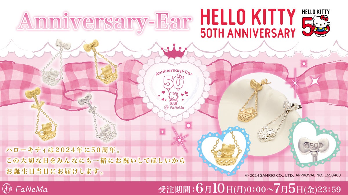 FaNeMaのジュエリーブランド『Anniversary-Ear』から、『ハローキティ』50周年を祝うオリジナルアクセサリーが登場します。