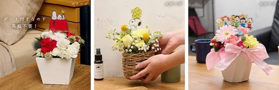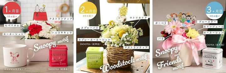 OKAIMONO SNOOPY flower seriesの新作「フラワーコレクション」は、毎月異なるモチーフのアレンジメントが楽しめる定期便です。